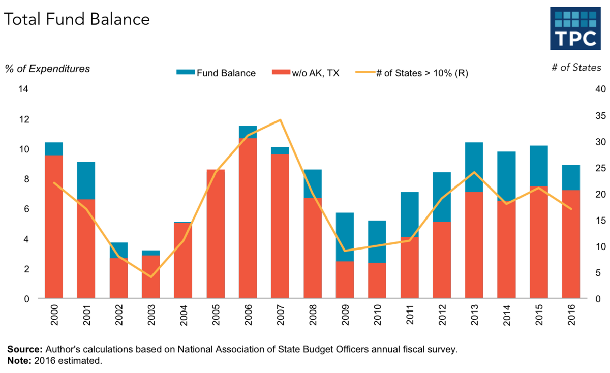 聽survey reports that by last year total state balances had been rebuilt to more than 10 percent 聽(7.5 percent excluding Alaska and Texas). In 2016, it is expected to fall to 8.9 percent in large part because Alaska had to take about聽to shore up spending in the face of collapsing oil prices.聽