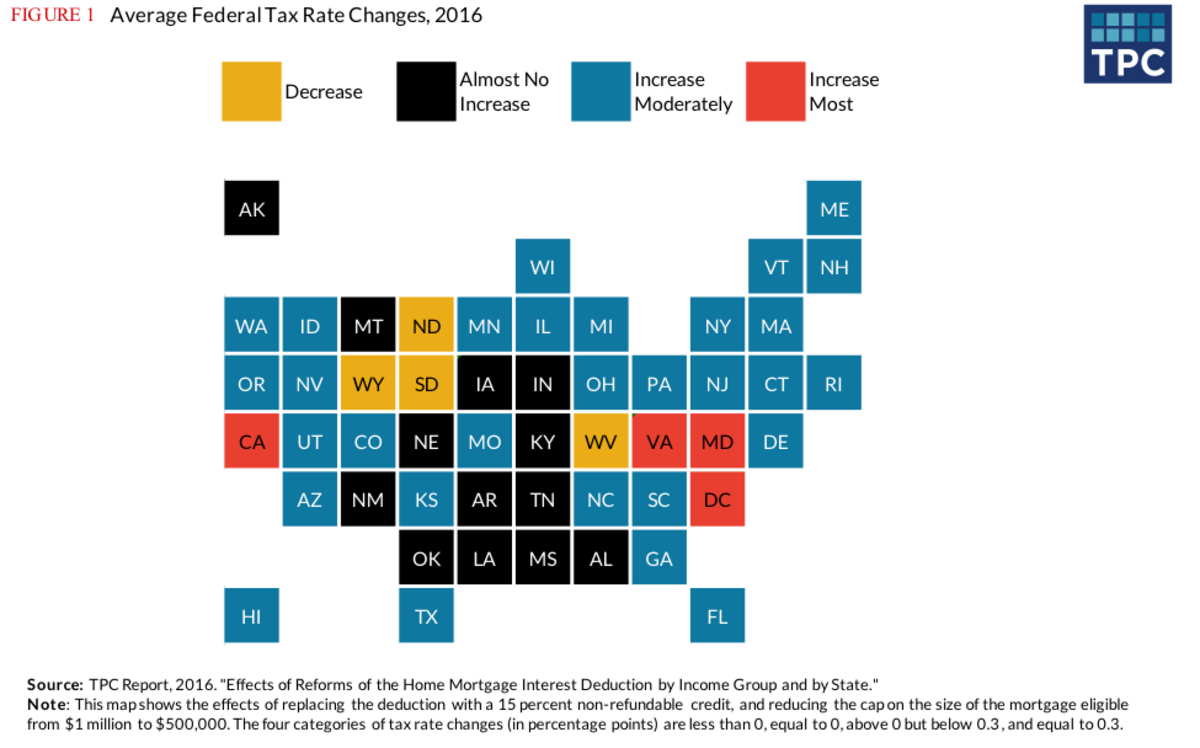 However, we found important differences among the states we analyzed. For example, in high-income states such as California and New York, a greater percentage of taxpayers would pay more in federal tax and a smaller percentage would enjoy a tax cut. In Texas, which has no state income tax, fewer residents itemize. Thus, fewer would lose if the mortgage interest deduction is replaced.