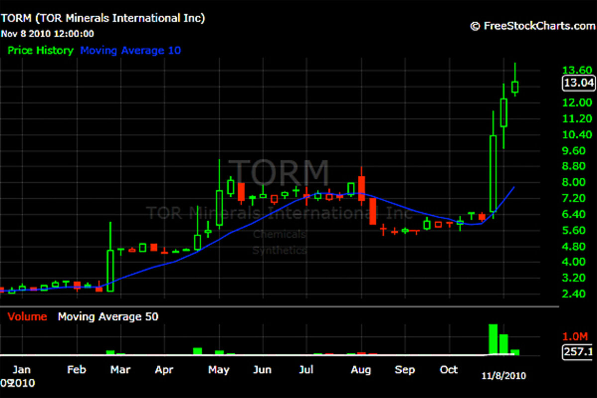One of them, Tor Minerals (), was so off the beaten path (they make specialty chemicals for paint!) that you really only had "price" to tell you the story on the way up: