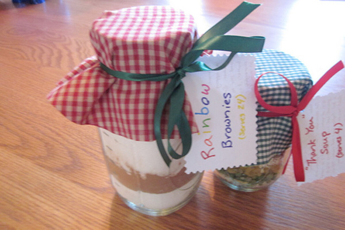 The jar on the left, obviously, is a 鈥淩ainbow Brownie鈥 mix, to which you add just a couple liquid ingredients, pour into a pan, and bake at 350 F for 30 minutes. The one on the right is a soup mix, to which you add 6 cups of water (and, optionally, 1/2 lb. ground beef) and boil in a pot for 45 minutes (or in a crock pot for an afternoon).