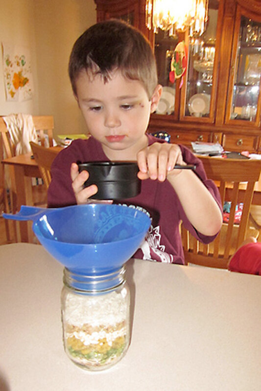 We added these ingredients to a quart jar, going right down the list. As you can , Joe helped with this.