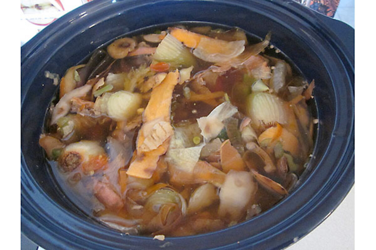 What about chicken/beef/turkey stock? If you have bones and cooked scraps left over from any meat dinner (yep, fish works, too, if you want to make fish stock), just use them as a component in the stock. If you want to call it chicken stock (or beef stock, or fish stock, or turkey stock鈥), I would use 50% meat and 50% vegetables.