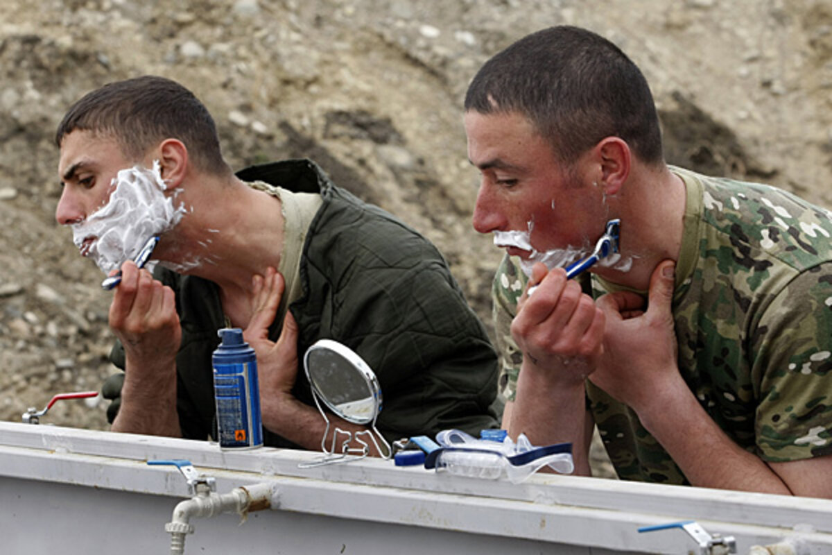聽With everything but the electric razor, I usually shave in the shower with a bit of soap on my face without any problems at all and I can usually do it while rinsing soap from the rest of me. I can usually tell by feel where I need to touch up, though a small mirror in the shower can help.