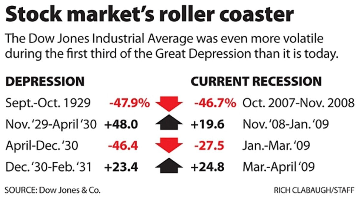 The last time the world's financial system was this wobbly, Herbert Hoover was president and the Dow had plunged 48 percent from September to November 1929. Take a look at the chart above showing the first two drops and rebounds of the Great Depression and the current recession.