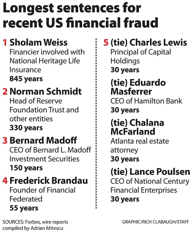 It's the third-longest sentence for white-collar crime, according to a by Forbes magazine. Still, the sentence is six times longer than the 25 years that Bernard Ebbers received in 2005 for masterminding an $11 billion accounting fraud at WorldCom or the 24 years and four months that Jeffrey Skilling got for the felony charges in the financial collapse of Enron.