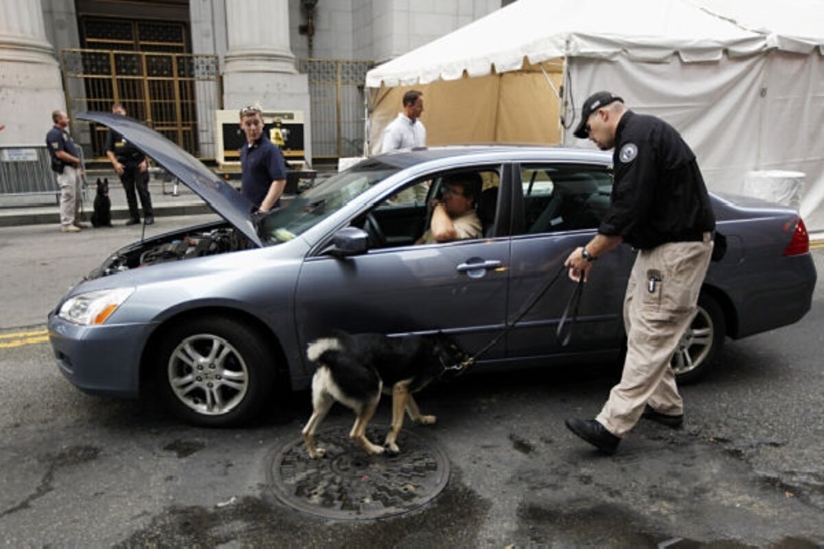 First, computer bags went on the ground, where a police dog gave an olfactory examination. Journalists emptied their pockets and transited through metal detectors . Then the Secret Service opened the computer bags, turned the screening machine on, pulled out every electronic device and searched every nook and cranny. When he was through, a second dog — call him the quality control German shepherd — sniffed each bag all over again.