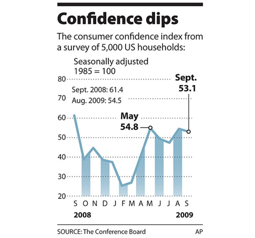 Consumer confidence fell 1.4 points from August to hit 53.1 in September, according to released Tuesday. Dipping for the third time in four months, the index seems unable to climb above 54.8, the high for the year set in May.