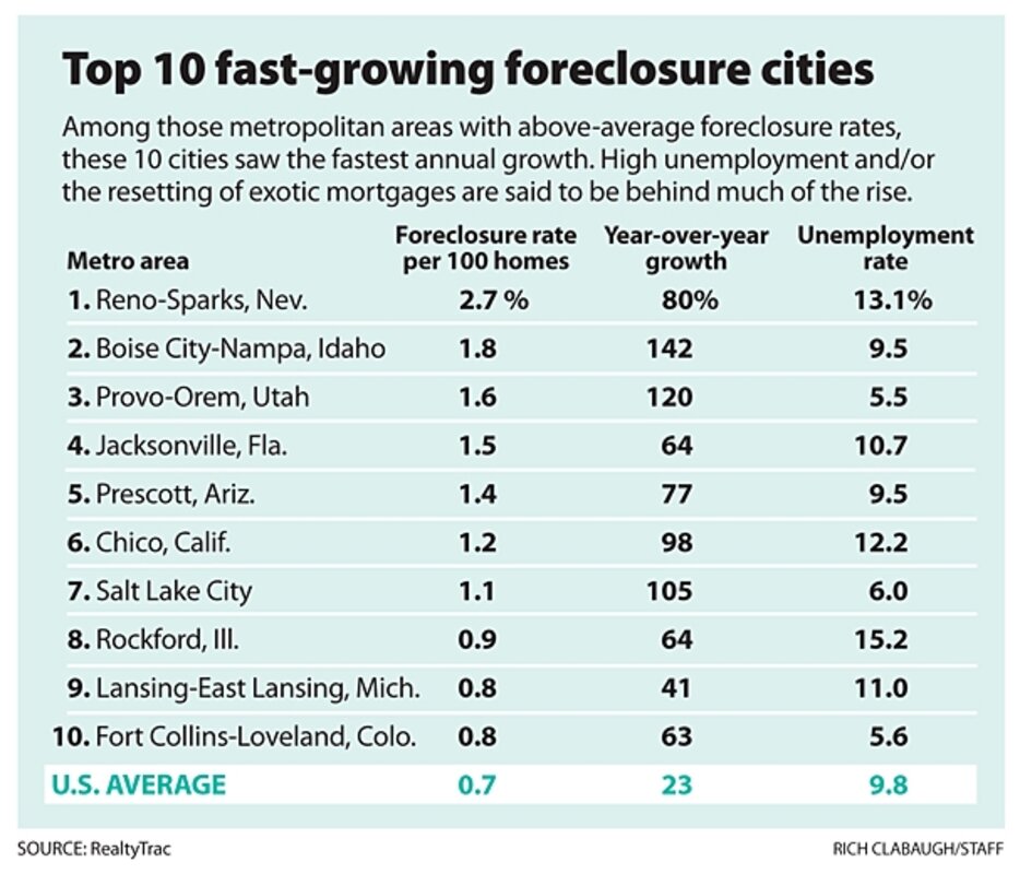 Take Reno-Sparks. It saw its total foreclosures jump 80 percent over the past year. Its 2.7 percent foreclosure rate is now the ninth-highest in the nation and thus makes it our No. 1 fast-growing foreclosure capital (click on the chart above for the entire list).