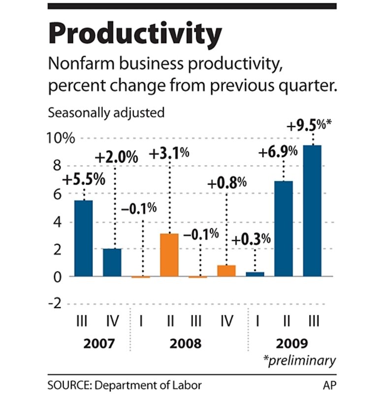 That's exactly what happened to American workers in the third quarter. Their productivity was on a tear, rising at an annual rate of 9.5 percent in nonfarm businesses from the previous quarter, according to released Thursday. It's the biggest seasonally adjusted gain in six years (click on chart at right).