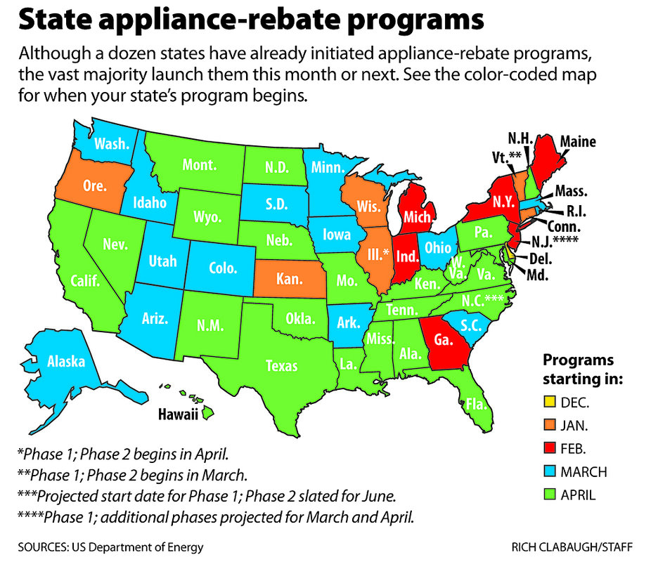 In March, 14 states 鈥 including Arizona, Iowa, Minnseota, and Ohio 鈥 kick off appliance-rebate programs. In April, another 23 states launch their rebate programs.
