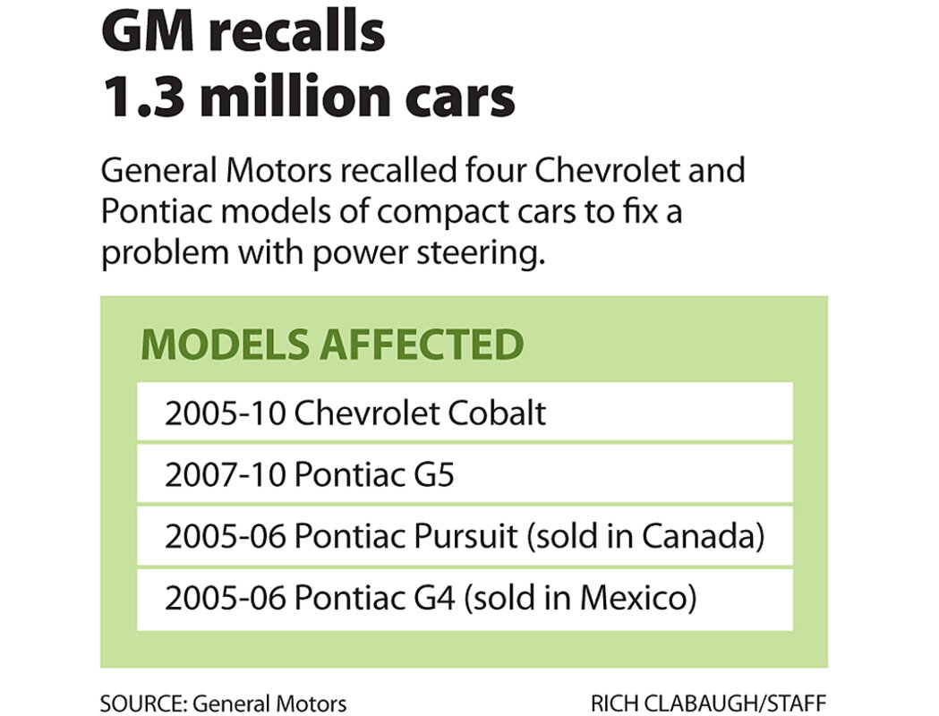 After more than 1,100 complaints about the sudden loss of power steering in its compact cars, General Motors announced Tuesday it is preparing to recall 1.3 million vehicles.