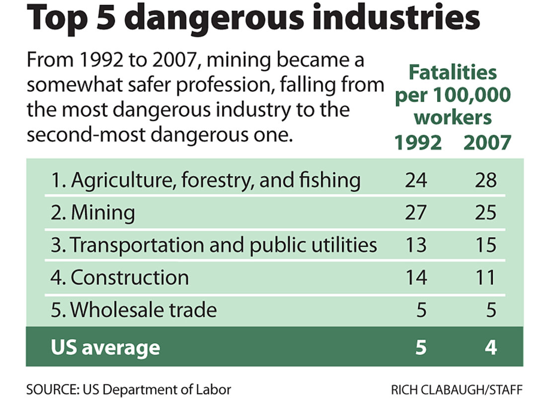 Two decades ago, coal mining was the most dangerous industry in the United States. By 2007, it had managed to move to No. 2, behind agriculture, forestry, and fishing, according to the Department of Labor. (Click on the chart at left to review the most dangerous professions.) Last year, the number of mining fatalities fell to a record low of 34, with coal mining accounting for 18 of those.