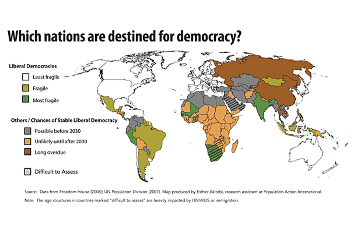 When demographer Richard Cincotta undertook three years ago to determine which nations had the best chance of becoming liberal democracies before 2030, he colored in all of North Africa, some of the Middle East, and on into central Asian countries such as Kazakhstan, Afghanistan, and Pakistan (see map above).
