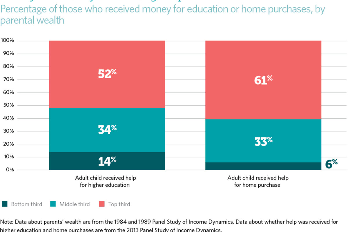 Meanwhile, just 14 percent who received help for higher education and 6 percent who received help for home purchases were raised in the least wealthy families.