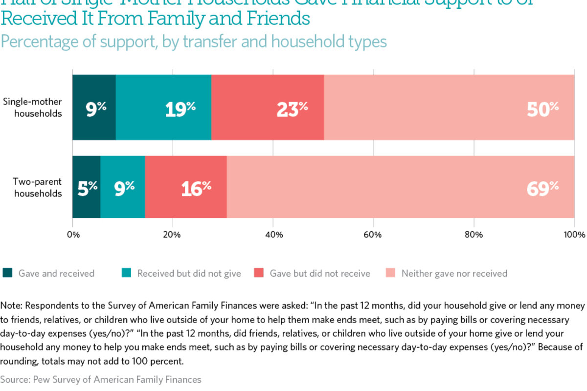 Still, the standout group, the one involved with these types of financial transactions more often than any other, is single mothers, even after accounting for other factors including race, age, and education. Half of single moms in the study reported giving or receiving money within the past year. Of those who gave or money, however, three quarters said that doing so was a burden.