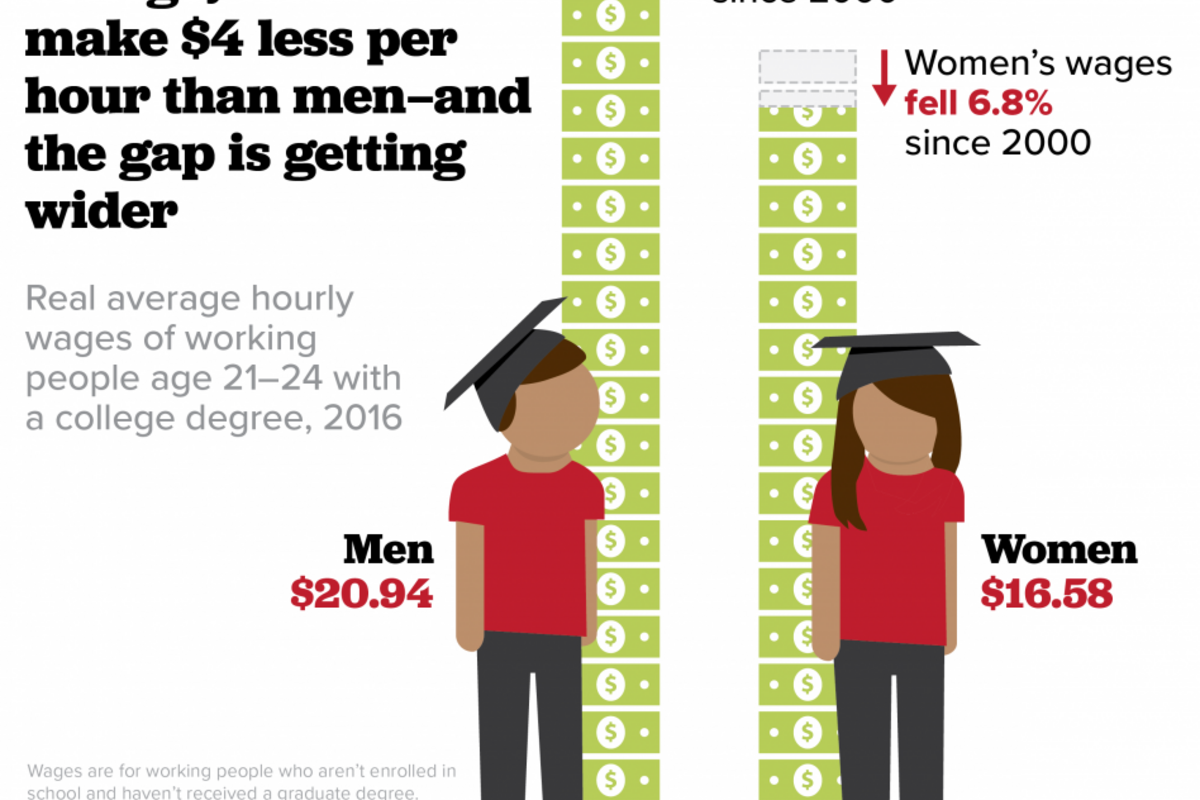 But a new out Tuesday argues that the gulf forms well before that. At the earliest stages of their careers, female workers with a college degree in the US earn an average hourly wage of $16.58, according to data compiled by the Economic Policy Institute (EPI), a left-leaning Washington think tank. Young men with a college degree, meanwhile, earn an average of $20.94 an hour - $4.36 more than their female counterparts. That shakes out to a $9,000 annual pay gap.