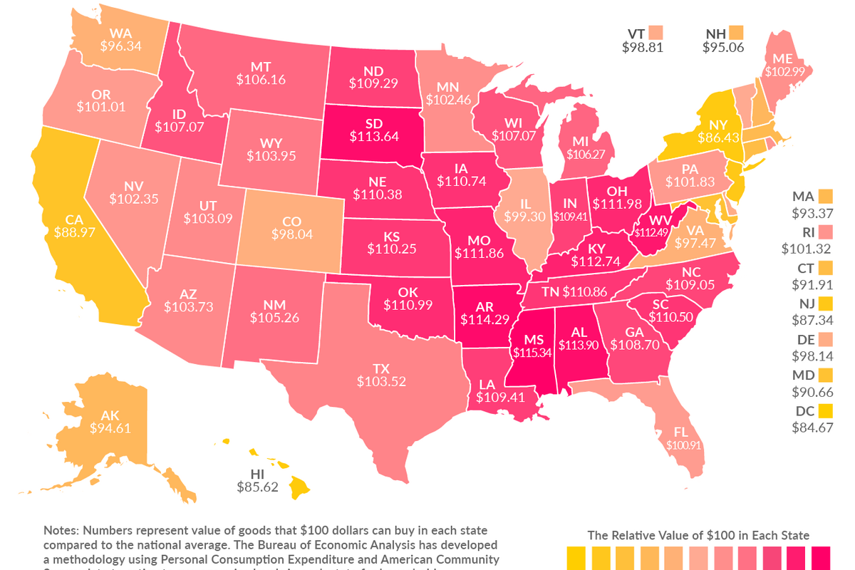 There are exceptions, Cole points out. North Dakota, home to the oil and gas industry, had a high average income but cheap prices in 2014, the year BEA's data was compiled, thanks to a wide availability of land. That was before oil prices went in to free fall and the local economy took a hit, but for $100, North Dakotans got $109.29 worth of value -- 23 percent more than Californians.听