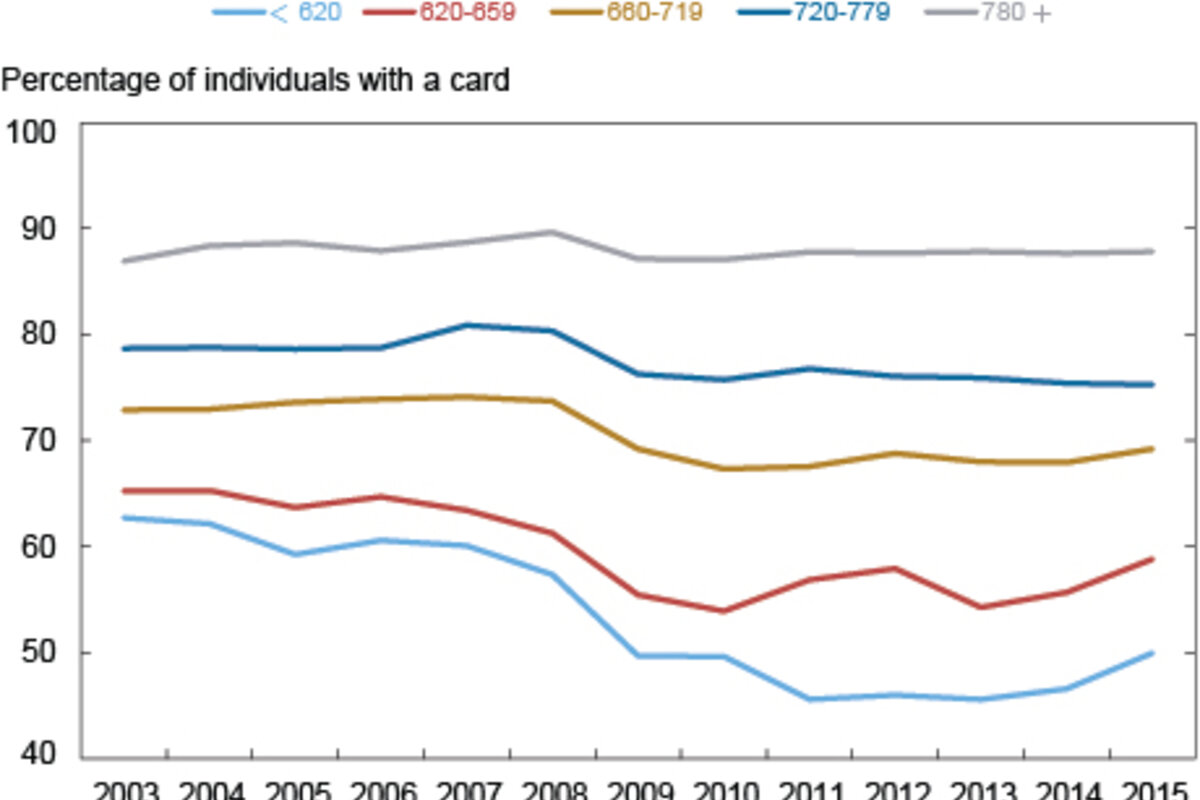 In the years before the Great Recession, 68 percent of Americans with credit cards used them. This declined to 59 percent during the Great Recession, and since has rebounded to 61 percent today, reports the Fed.聽However, among people with high credit scores, 88 percent use their credit cards, a share that is largely unchanged from decades past. Their credit limits also have grown between 2009 and 2015. Spending limits for borrowers with credit scores between 720 and 779 grew from $3,00 to $5,500 during that period. For those in the highest-rating category, 780 and above, limits nearly doubled from $4,200 to $8,000.