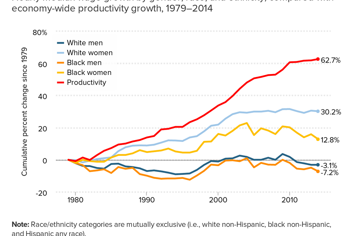 In comparing women, EPI found that black women earned nearly 12 percent less than white women last year. In 1979 鈥 when wages for all Americans started moving in the opposite direction of growing productivity 鈥 the wage gap between black and white women was only 4.5 percent. Compared to white men, black women earned 34 percent less last year.