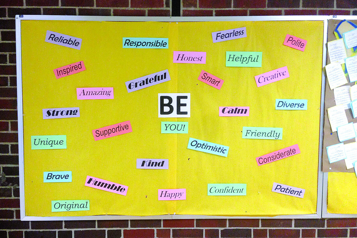The bulletin board is, in many ways, unremarkable. You might see something like this in any middle school across the US or beyond. Yet hidden in its seemingly unoffensive positivism is something altogether more radical.