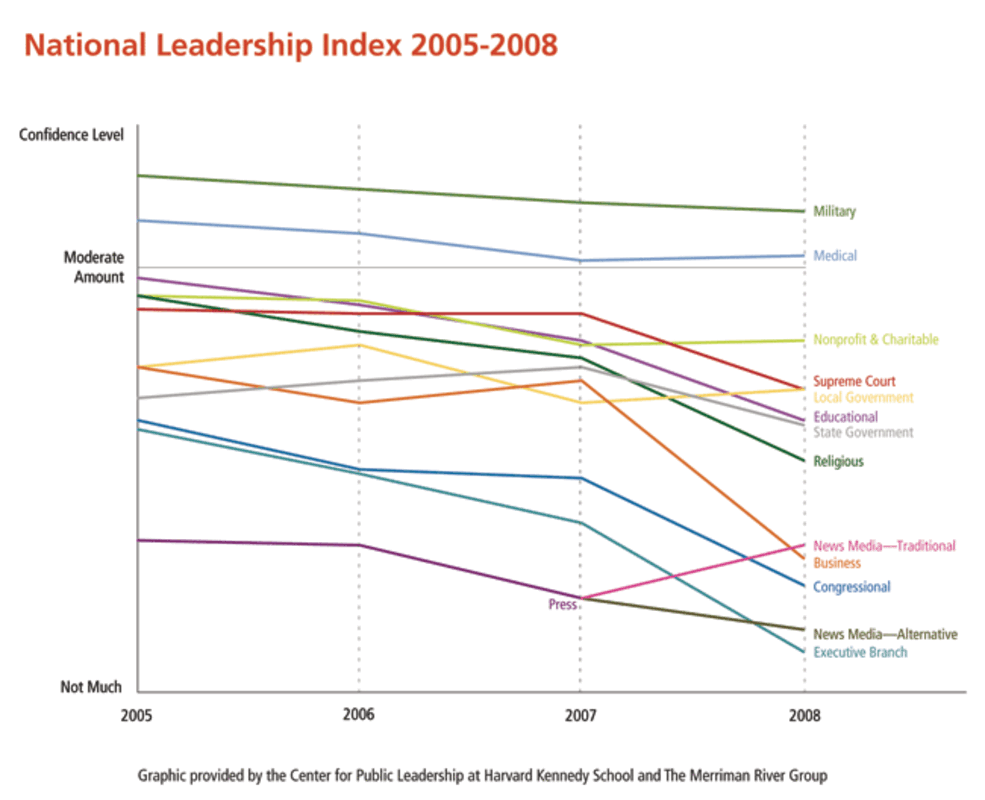 Leaders in only two institutions 鈥 the military and the medical profession 鈥 enjoy even a "moderate" level of public confidence. And then just barely.