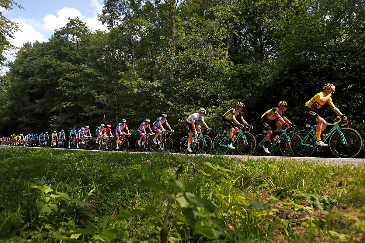 The pack with Netherlands鈥 Mike Teunissen wearing the overall leader's yellow jersey, right, rides during the third stage of the Tour de France cycling race start in Binche and finish in Epernay, July 8. The Tour, which covers 2,100 miles, began July 6 and will conclude at the Champs-脡lys茅es in Paris on July 28.