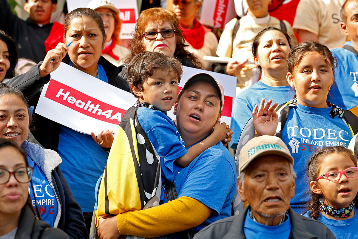 Oralia Sandoval, center, holds her son Benjamin as she participates in an Immigrant Day of Action rally on May 20 in Sacramento, California. Gov. Gavin Newsom has proposed offering government-funded health care benefits to immigrant adults ages 19 to 25 who are living in the country illegally.
