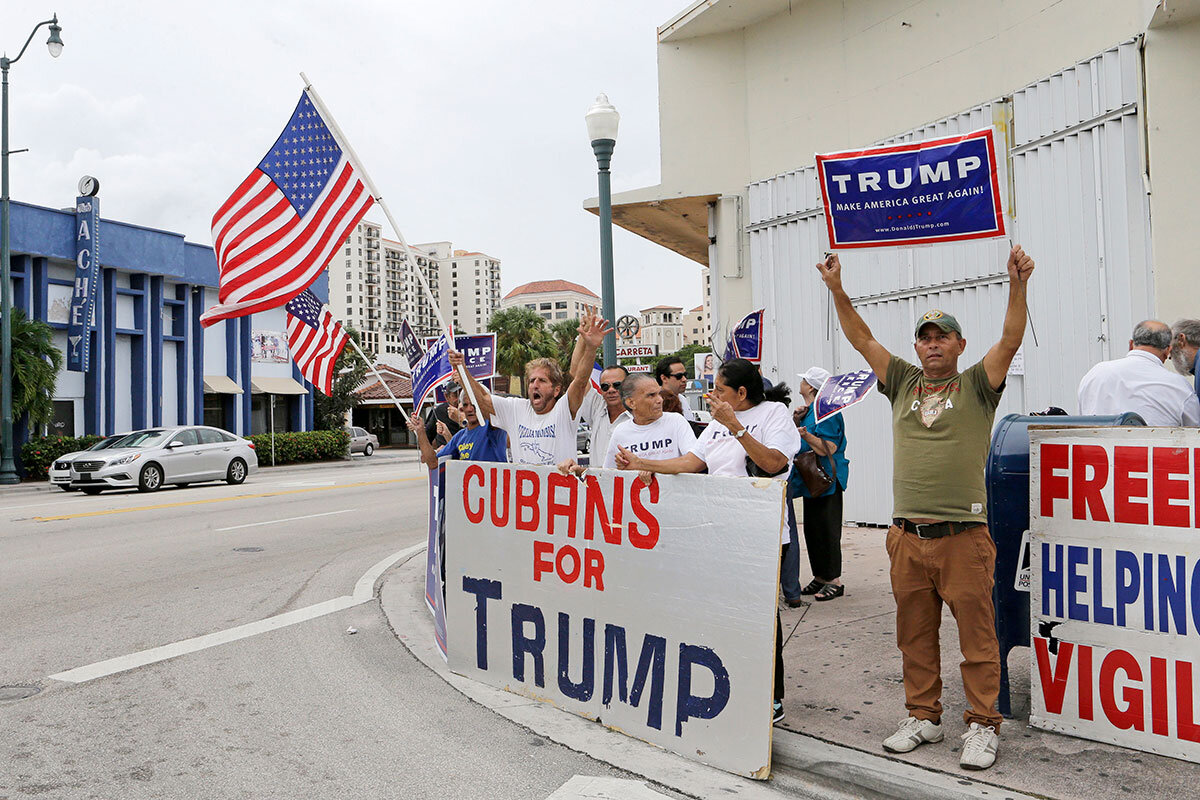 A group of Cuban Americans chant pro-Trump slogans as they demonstrate their support for Republican presidential candidate Donald Trump, Oct. 28, 2016, in Miami. President Trump鈥檚 immigration policies are not popular with Florida Hispanics. But fears of socialism could put enough in his column to tip the state.