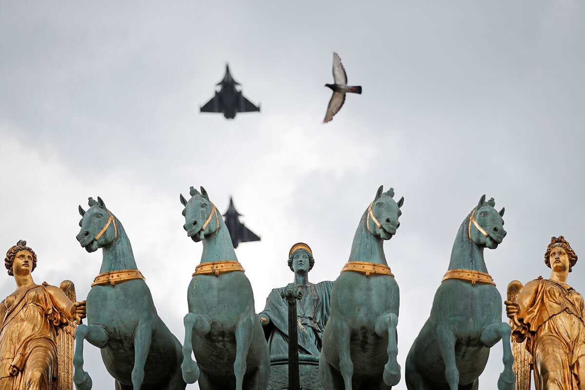 Dassault Rafale jet fighters of the French air force fly over statues of the Arc de Triomphe du Carrousel during a rehearsal for upcoming Bastille Day celebrations, in Paris, July 11, 2019. Bastille Day celebrations kick off on July 14 with a military parade along the Champs-Elys茅es and culminate in an evening fireworks display.