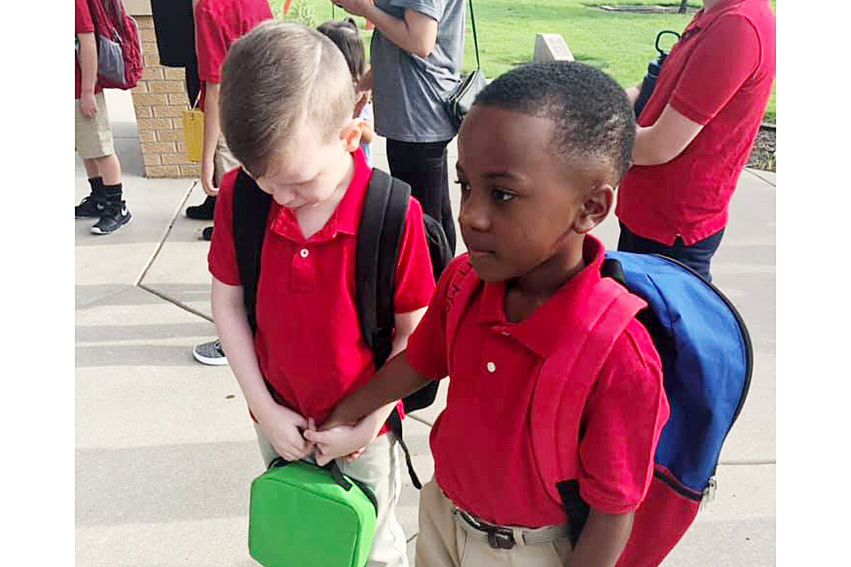 Courtney Moore of Wichita, Kansas, posted a photo on Facebook of her son, 海角大神, gently holding another boy鈥檚 hand: 鈥, he seen a kid balled up into a corner crying, so he went to console him, grabbed his hand and walked him inside of the school!鈥