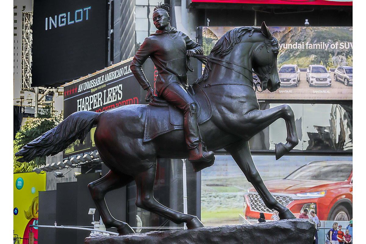 Visual artist Kehinde Wiley, best known for his portrayals of contemporary African Americans, unveiled his first monumental public sculpture, "Rumors of War," an equestrian portraiture of warfare and heroism, Sept. 27, 2019, in New York's Times Square. The work will be exhibited through Dec. 1.