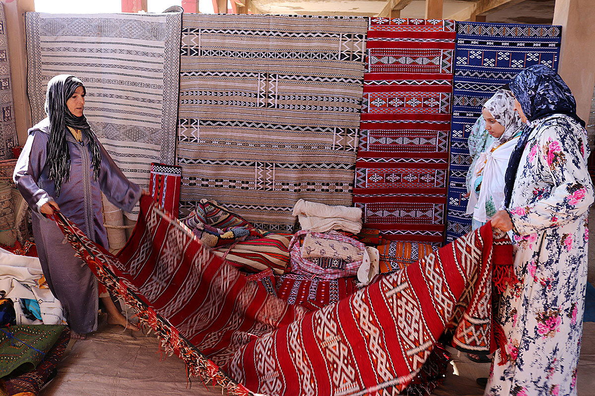 Fatima Rifiya (left), a veteran carpet seller, bargains with a customer over a Berber rug at her stand at the zarabi souk in Khemisset, Morocco, Oct. 15, 2019.