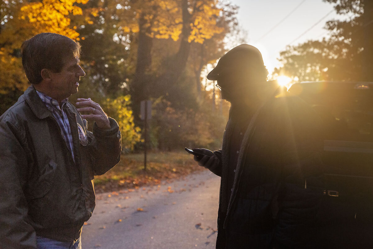 Adm. Joe Sestak confers with his policy director, Nate Kleinman, in the early morning on Oct. 15, 2019, already several hours into a long day of events across New Hampshire. Perhaps the longest of long shots in a crowded Democratic field, Admiral Sestak is doggedly forging ahead with his presidential bid, and says he's overcome steep odds before.