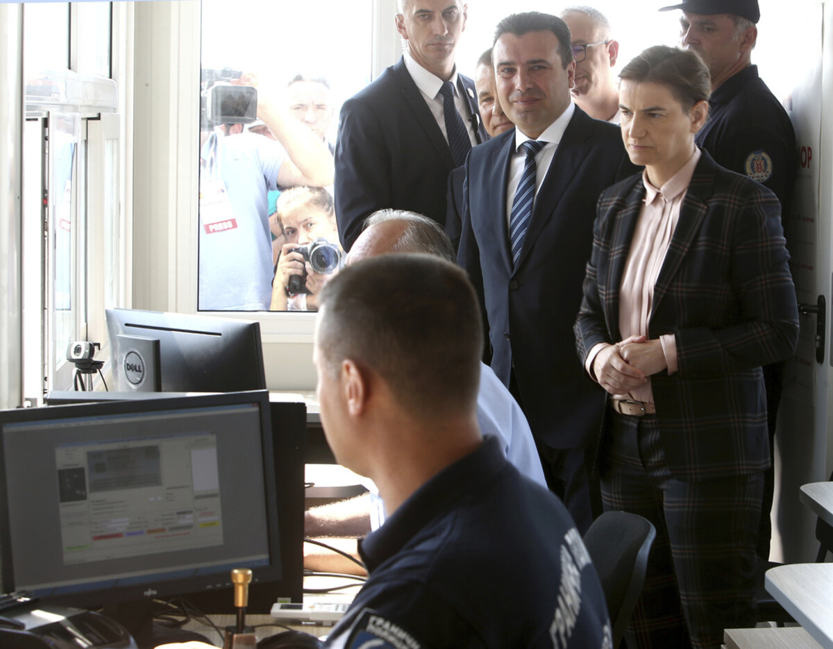 Serbia's Prime Minister Ana Brnabic, right, and North Macedonia Prime Minister Zoran Zaev, second from right, look at police officers from their two countries work together at a joint border crossing.