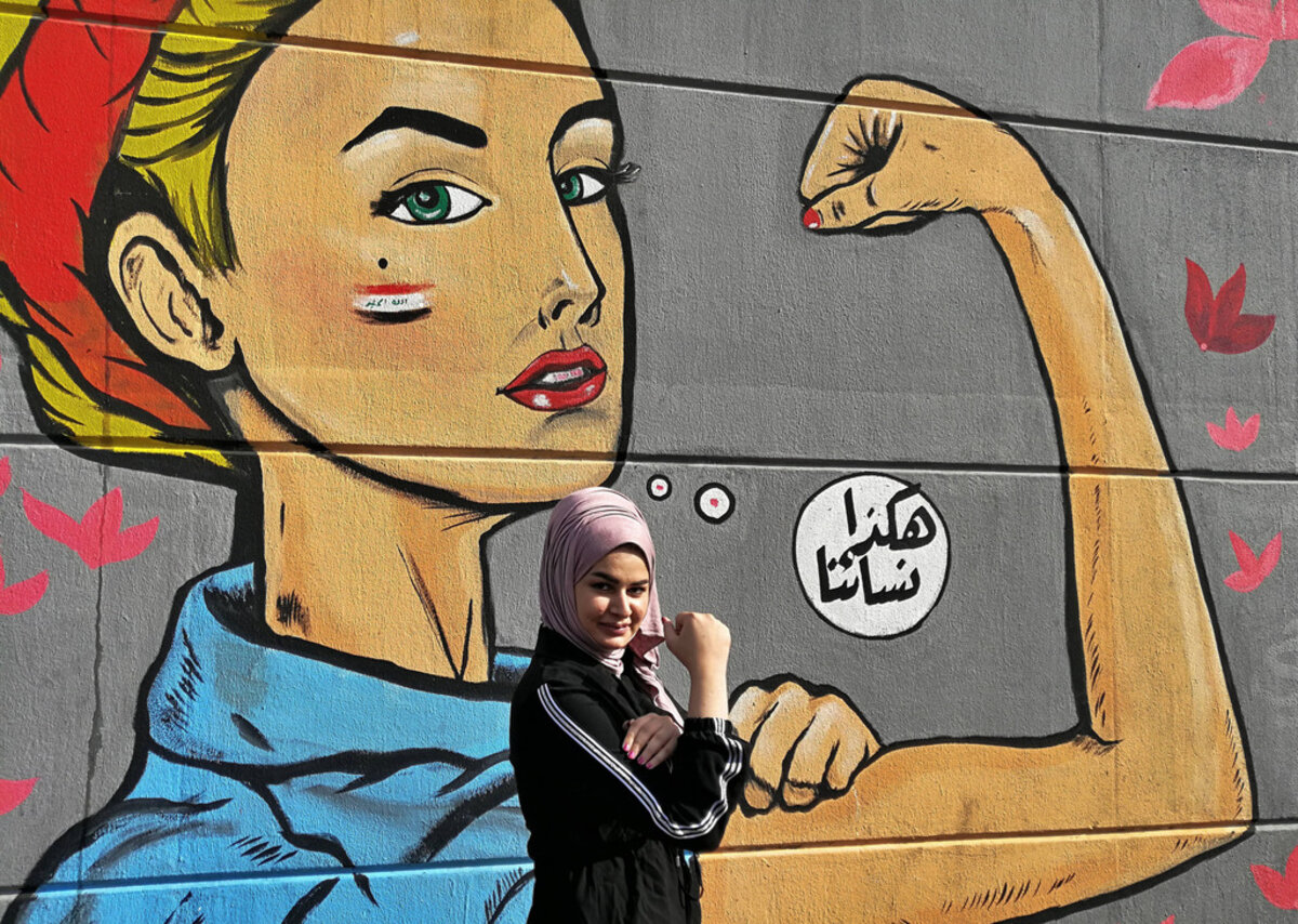 A woman poses for a picture near a mural with Arabic reading "those are our women" during ongoing protests in Baghdad, Iraq, Nov. 7.