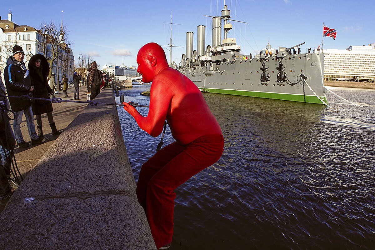 Activist Aleksander Kolpakov, painted in red, climbs into the Neva River in an attempt to wash off the redness of the revolution, on the 102nd anniversary of the 1917 Bolshevik Revolution in St. Petersburg, Russia, Nov. 7, 2019.