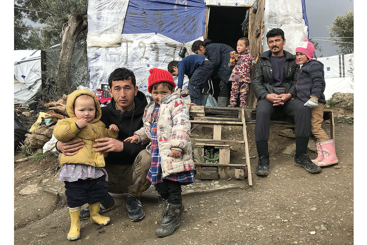 Khairullah Sabri (foreground) is living with his wife and two children in Lesbos, Greece, after having fled Afghanistan. Like thousands of others, they are staying outside the refugee camp itself, which is already several times over capacity.
