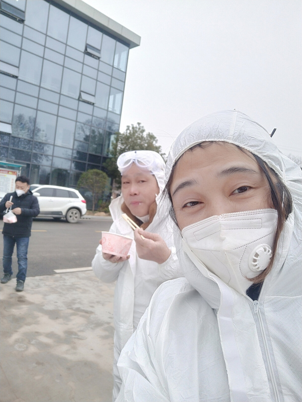 Chen Hui poses for a selfie in a protective suit with another volunteer as they deliver food to workers building a hospital in Hubei province, China, Feb. 11.
