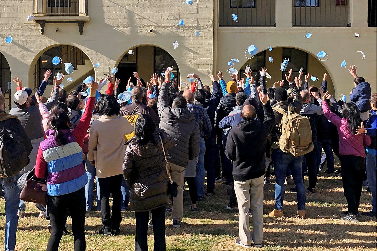 Evacuees from the China coronavirus outbreak toss their masks after finishing quarantine in Riverside, California, Feb. 11, 2020, in this image obtained via social media.