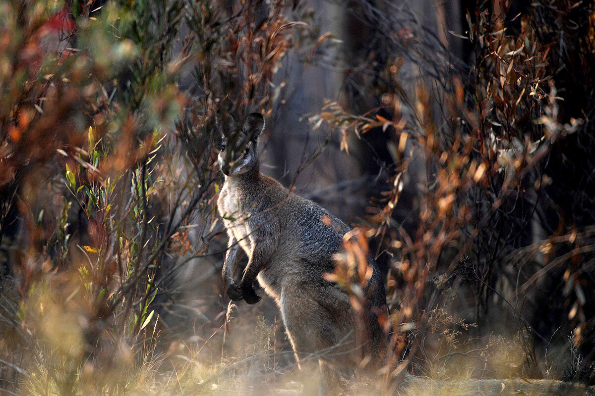 A wallaby sits among burnt trees at Kosciuszko National Park in Providence Portal, New South Wales, Australia, Jan. 11, 2020. The government has air-dropped hundreds of pounds of carrots and sweet potatoes to help the animals survive in the barren landscape.