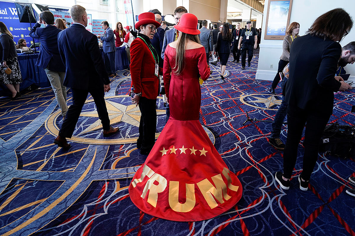 A woman wears a dress supporting President Donald Trump at the Conservative Political Action Conference annual meeting at National Harbor in Oxon Hill, Maryland, Feb. 27, 2020.