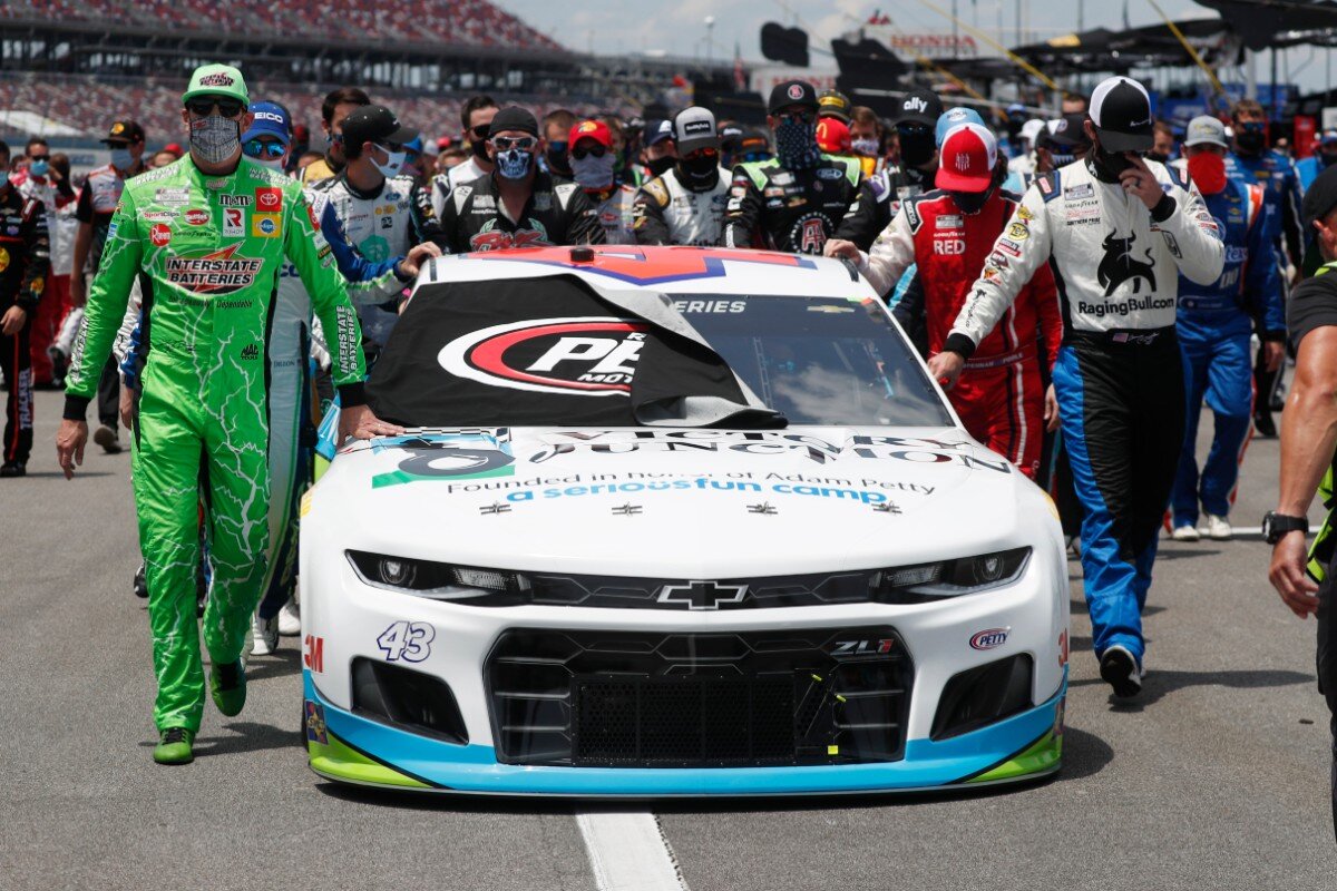 On Monday afternoon, the entire field of 39 drivers and their crews quietly , pushing his car ahead of them and onto the track. It was an extraordinary statement of solidarity and a rebuke of racism.聽