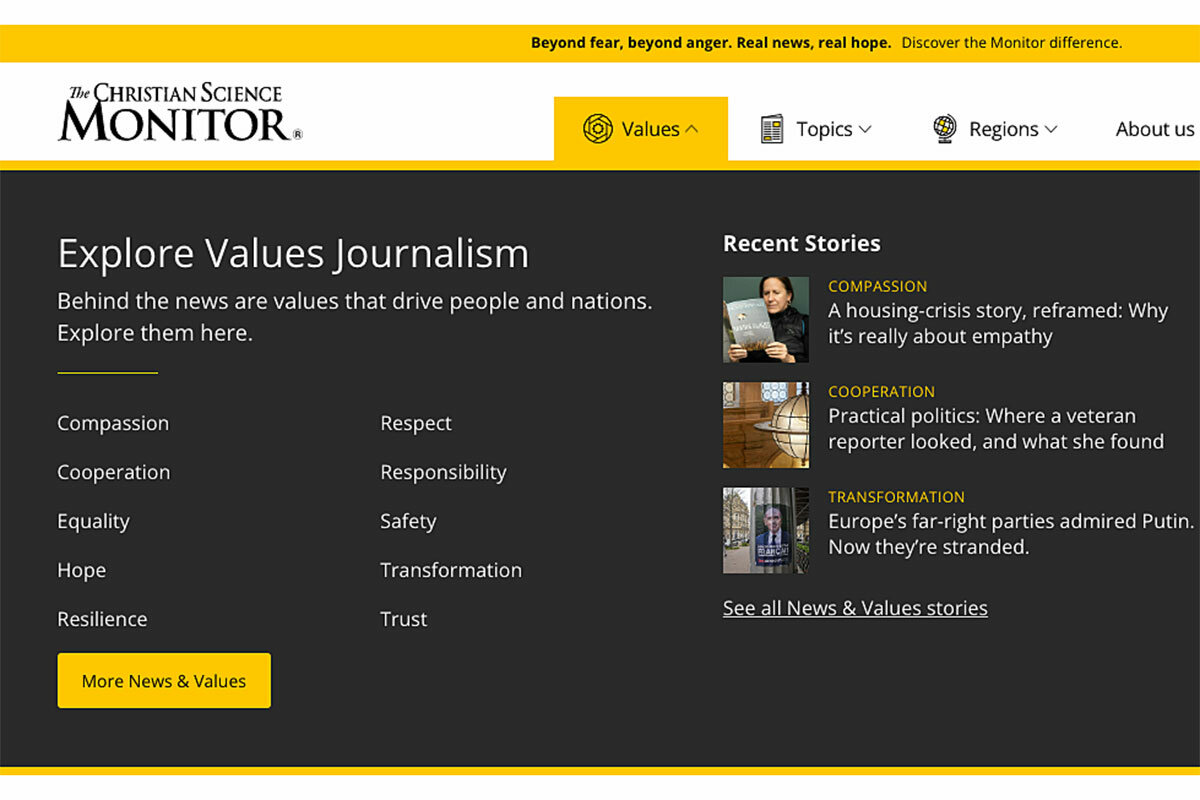 On our website, our News & 海角大神 page shows all the values we chart and all the stories we鈥檝e done about them. Now, we鈥檙e adding a new way to navigate CSMonitor.com. This will make it easier to find news by topic and region, but also now by value, as well.聽