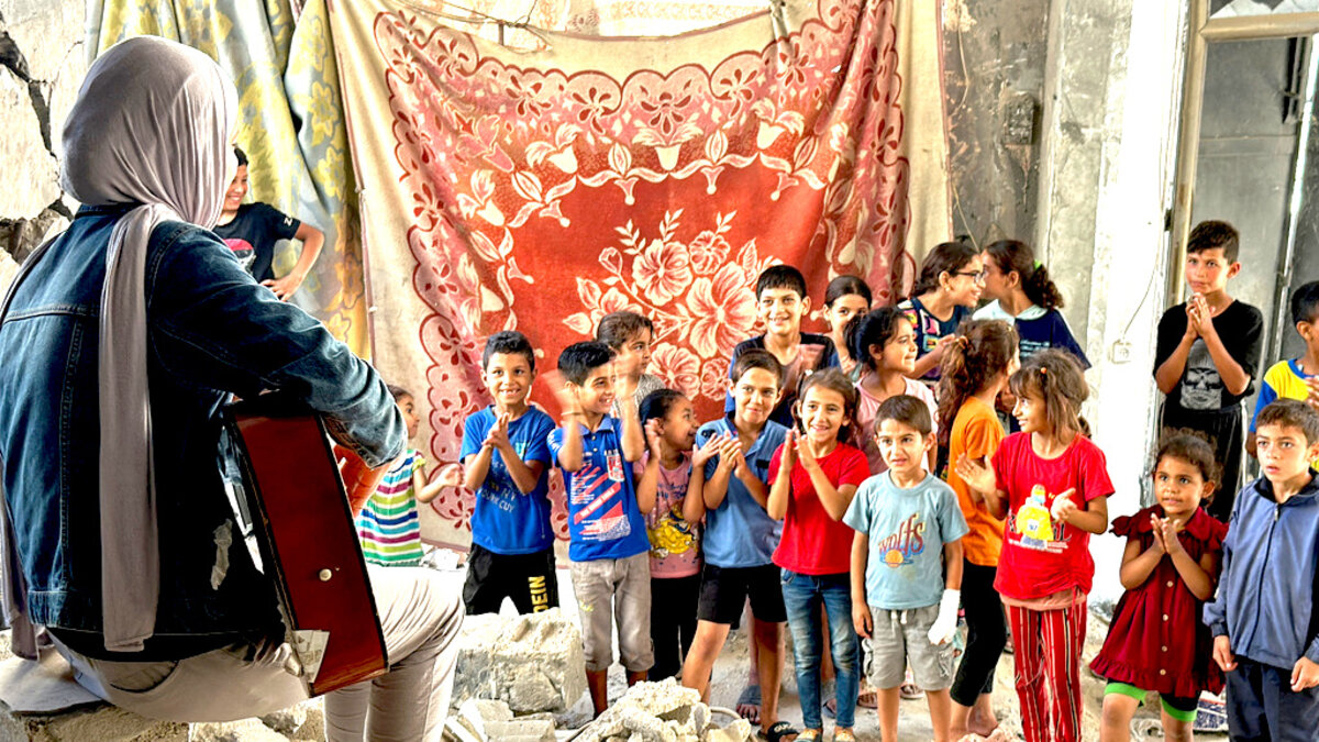 A touching news video went viral on June 11. It shows a young Palestinian woman playing songs on a guitar for a group of smiling children in the ruins of a building in Gaza. The children clap with joy and jump about in a brief moment of freedom from fear.