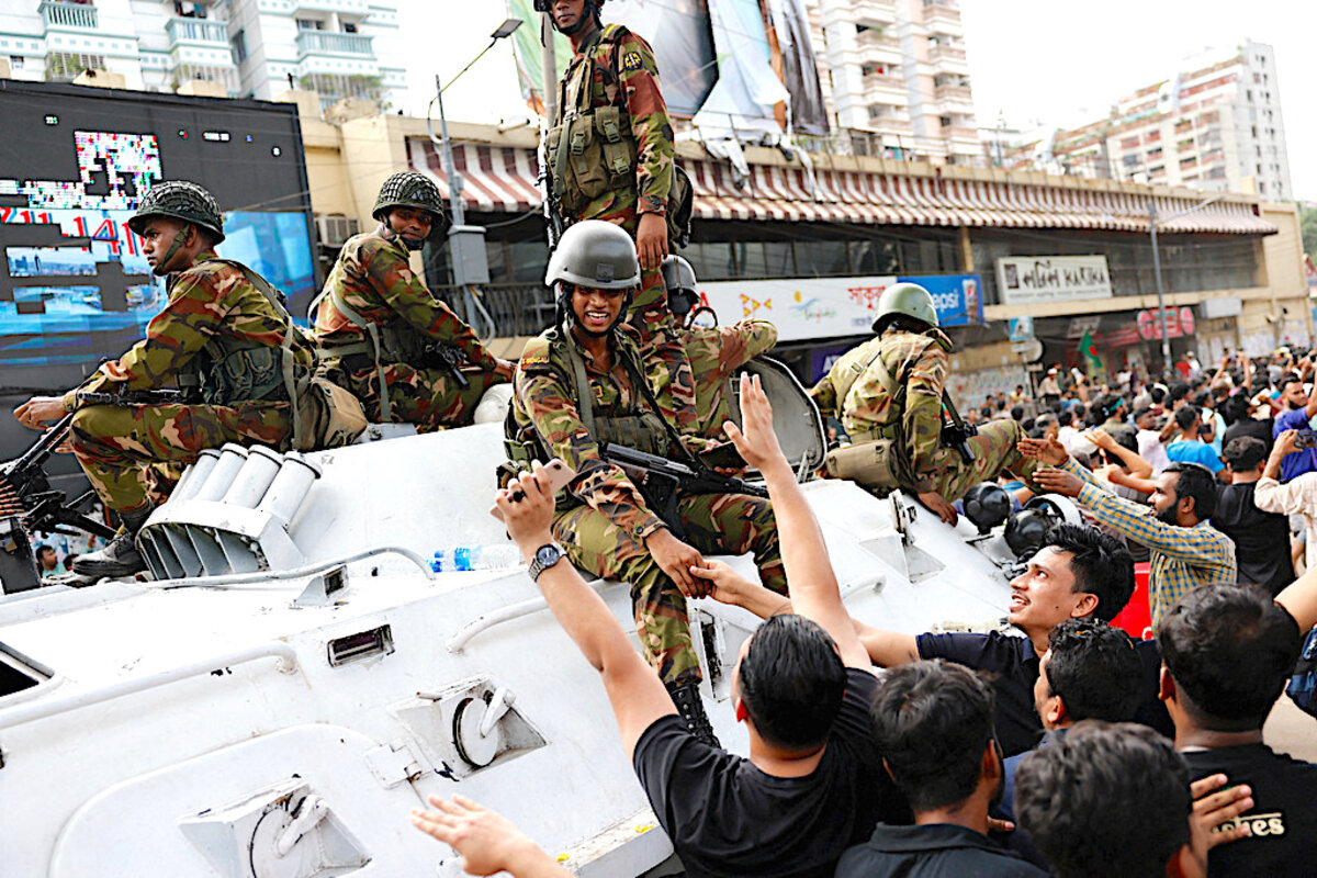 鈥 Bangladesh prime minister resigns, flees: Weeks of protests against a quota system for government jobs descended into violence and grew into a broader challenge to Sheikh Hasina鈥檚 15-year rule. The Monitor鈥檚聽Sina Hasan adds that some Bangladeshis, facing an uncertain future, are worried about a possible resurgence of religious fundamentalism and the safety of the country鈥檚 non-Muslim population.