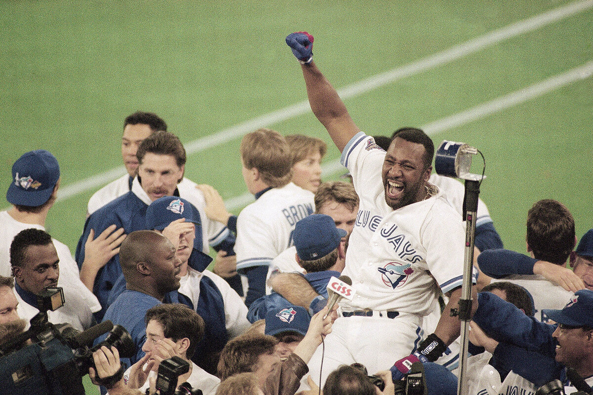Toronto's Joe Carter gets a victory ride on his teammates' shoulders after his World Series-clinching home run in the ninth inning of Game 6 against the Philadelphia Phillies, Oct. 23, 1993.