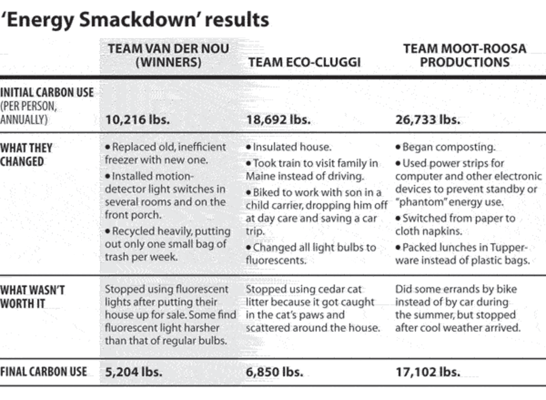 The competition began in March with a baseline assessment of each family's energy use. They plugged their lifestyle numbers (electricity use, travel, gas use, garbage generation) into a CO2 emissions calculator ().