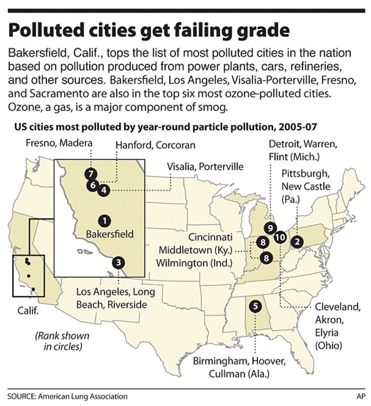 Bakersfield has moved into first place as the city with the most fine particulate pollution, according to report released Wednesday by the American Lung Association, which annually ranks America鈥檚 cities with the unhealthiest air. Last year, the city was third behind Pittsburgh and Los Angeles.