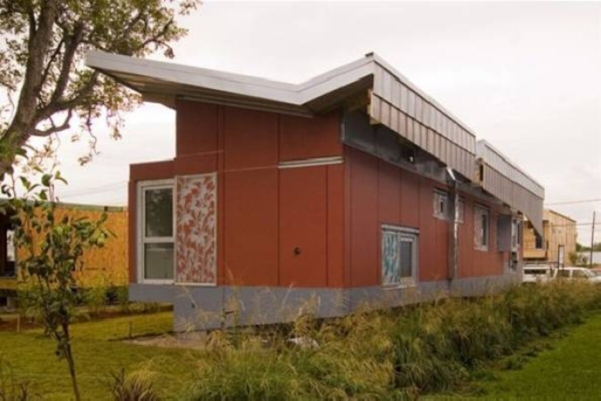 It is long and narrow like the traditional New Orleans shotgun home and sits on a raised 4-foot base. It also has a front porch. But the home is contemporary in design, with sharp angles and energy efficient features like solar panels and a roof designed to capture and recycle water.