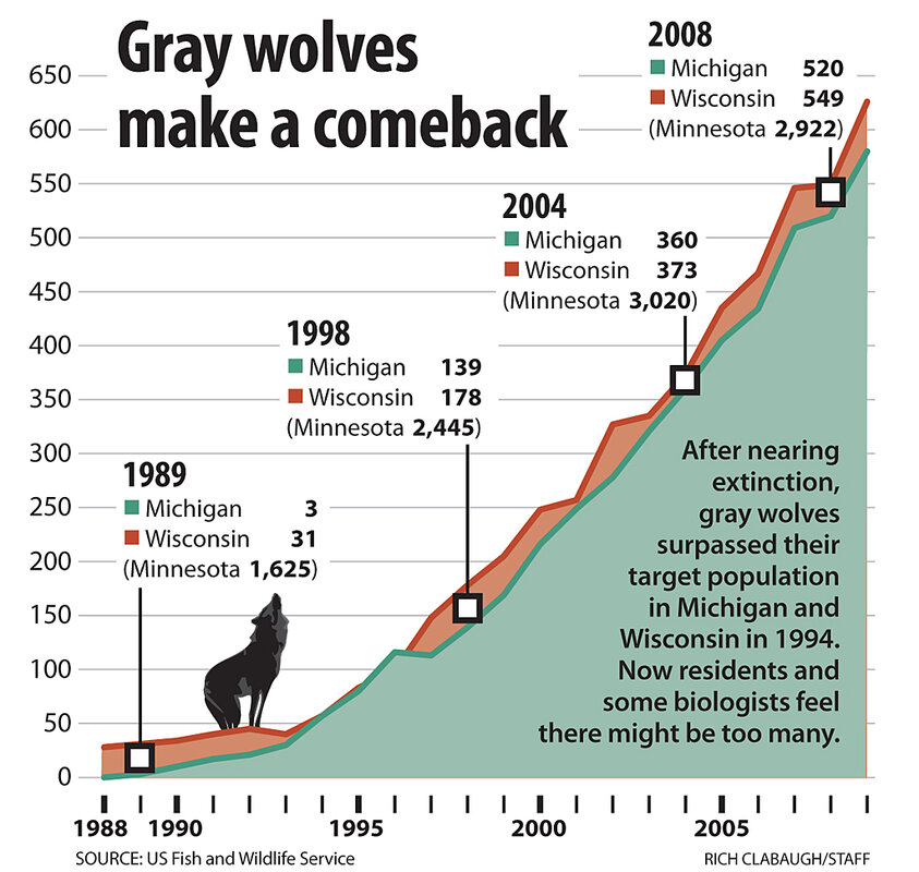 The wolf's success has surprised even some experts. In 1973, when the Endangered Species Act became law, biologists envisioned an eventual population of 100 wolves in northern Wisconsin and Michigan. Today wolves in the two states number well above 1,000.
